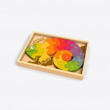This is a fun puzzle toy for any small child. It has large smooth pieces in vibrant colors that stack and build. Each one has the color labeled for extra fun. They stack together neatly when done. We are big fans of wood toys and this product is nicely done with smooth edges and a durable feel.